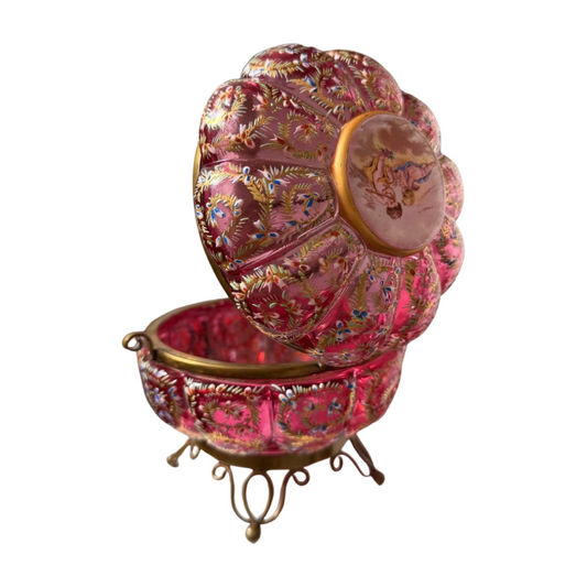 Antique Bohemian Cranberry Glass Casket with Cherub Enamel Lid – Hand-Painted Floral Gilding on Ormolu Mounts