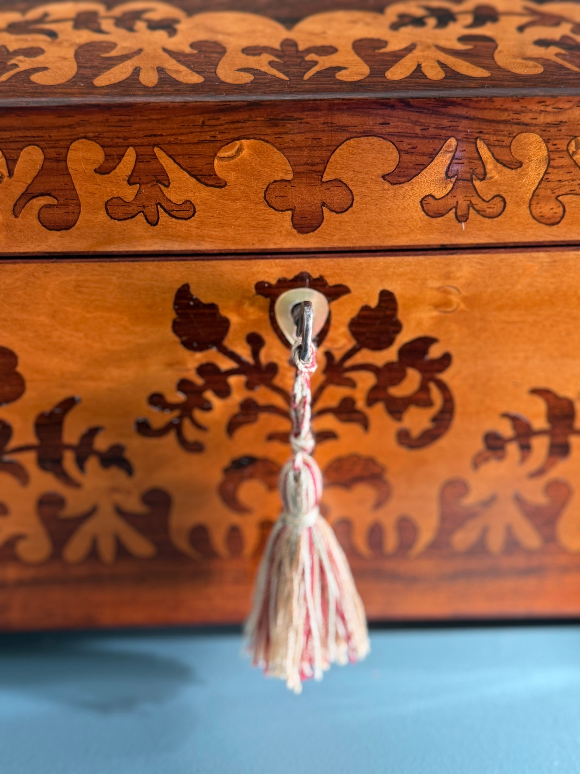 A piece that speaks to an era when tea was treasured as highly as silver, this exceptional English tea caddy is crafted in the celebrated Tunbridge Ware tradition, its warm honey-toned wood inlaid with intricate foliate marquetry in contrasting woods. The scrolling botanical motifs wrap gracefully around the lid and body, creating a sense of movement and quiet luxury.