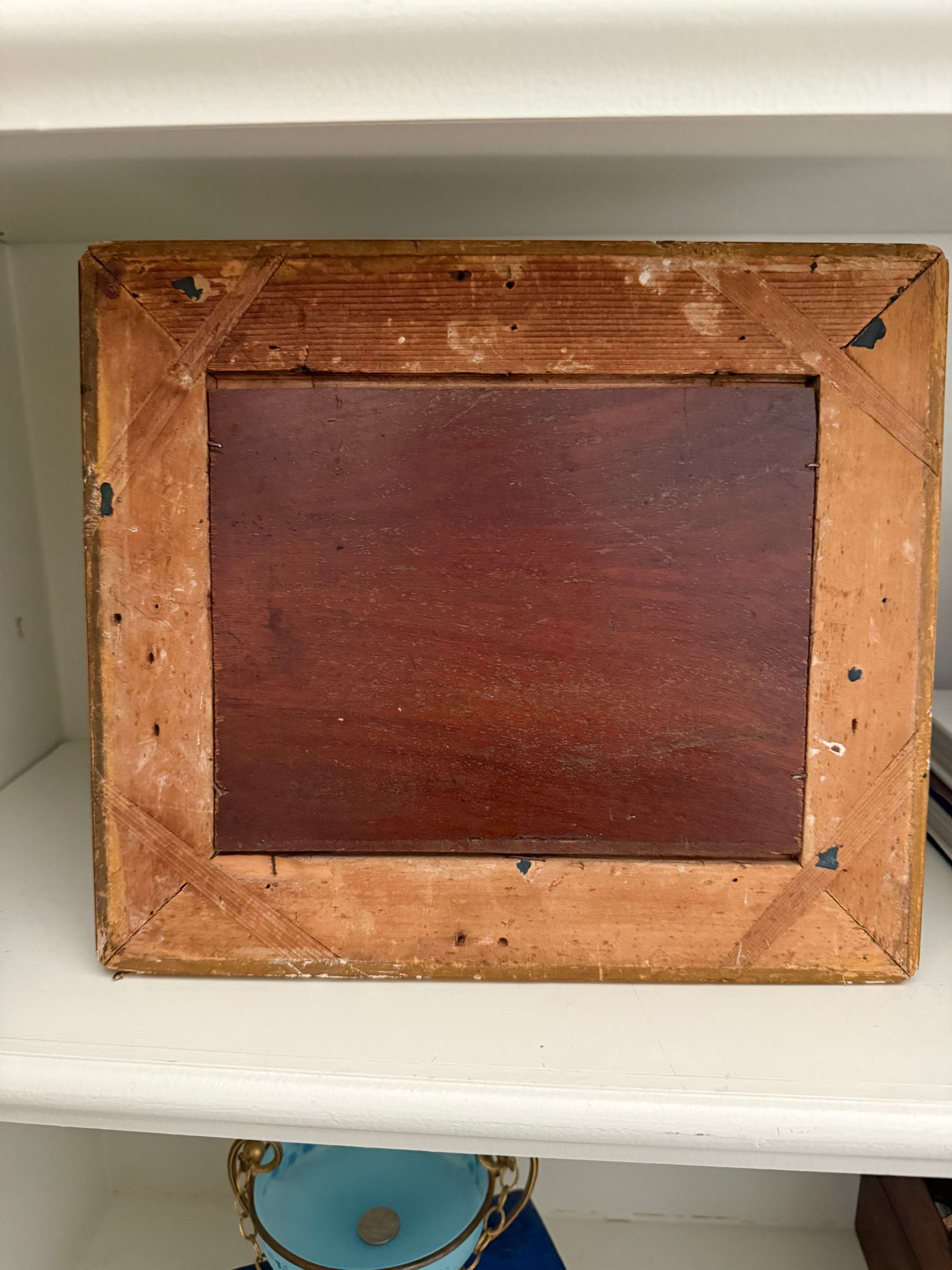 The painting is housed in its original gilt wood frame, which features delicate inner beading and a softly rounded edge. The frame shows minor wear, small chips, and touch marks along the corners and edges — all consistent with its age and history, adding to its authentic character and timeless appeal.