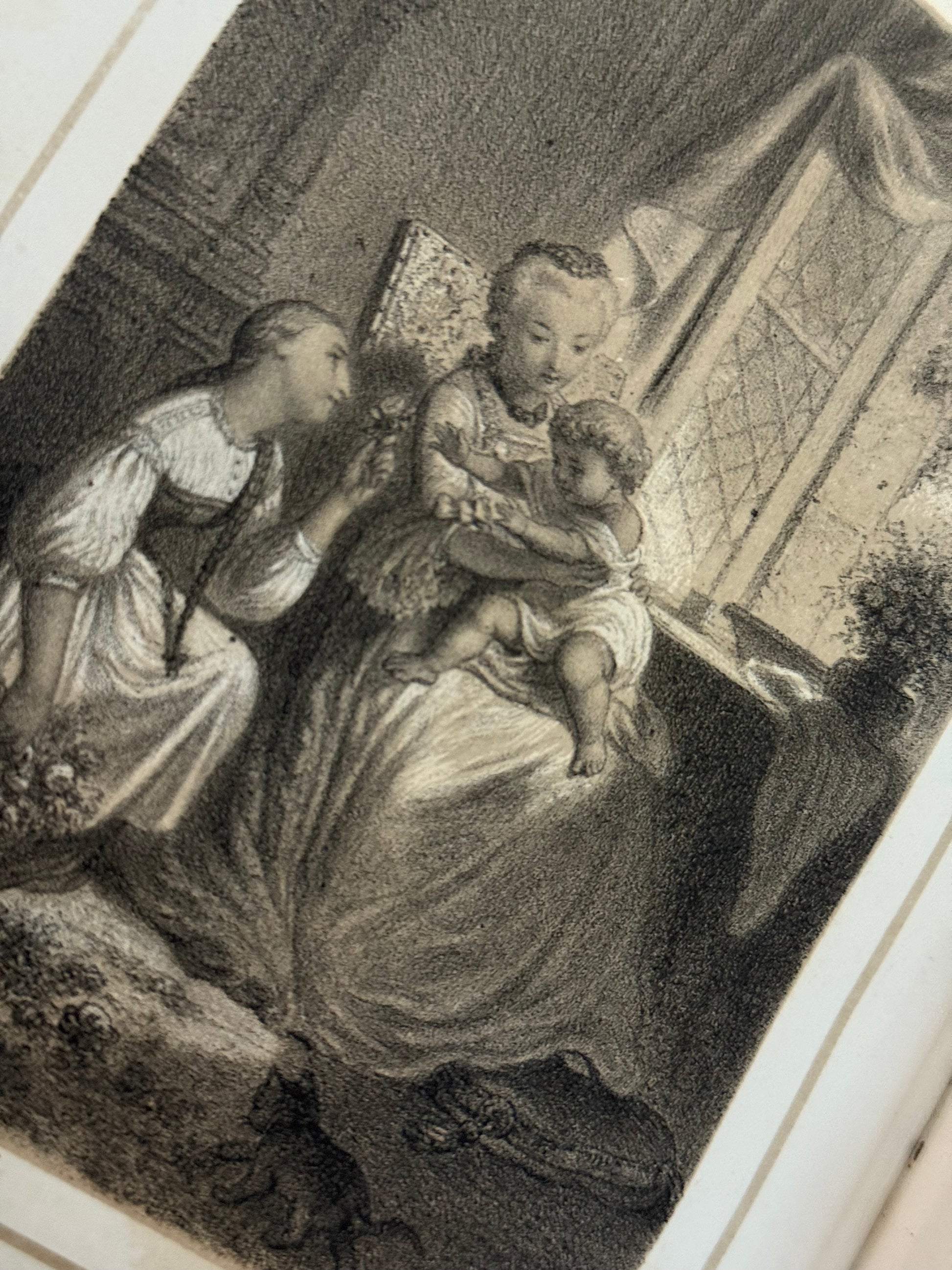 Inside, the pages open to charming engravings and the title page denoting translation by A. Bordot. The collection itself draws from moral tales written by Swiss author Christoph von Schmid, whose stories were beloved throughout Europe for their timeless lessons and sentimental tone.