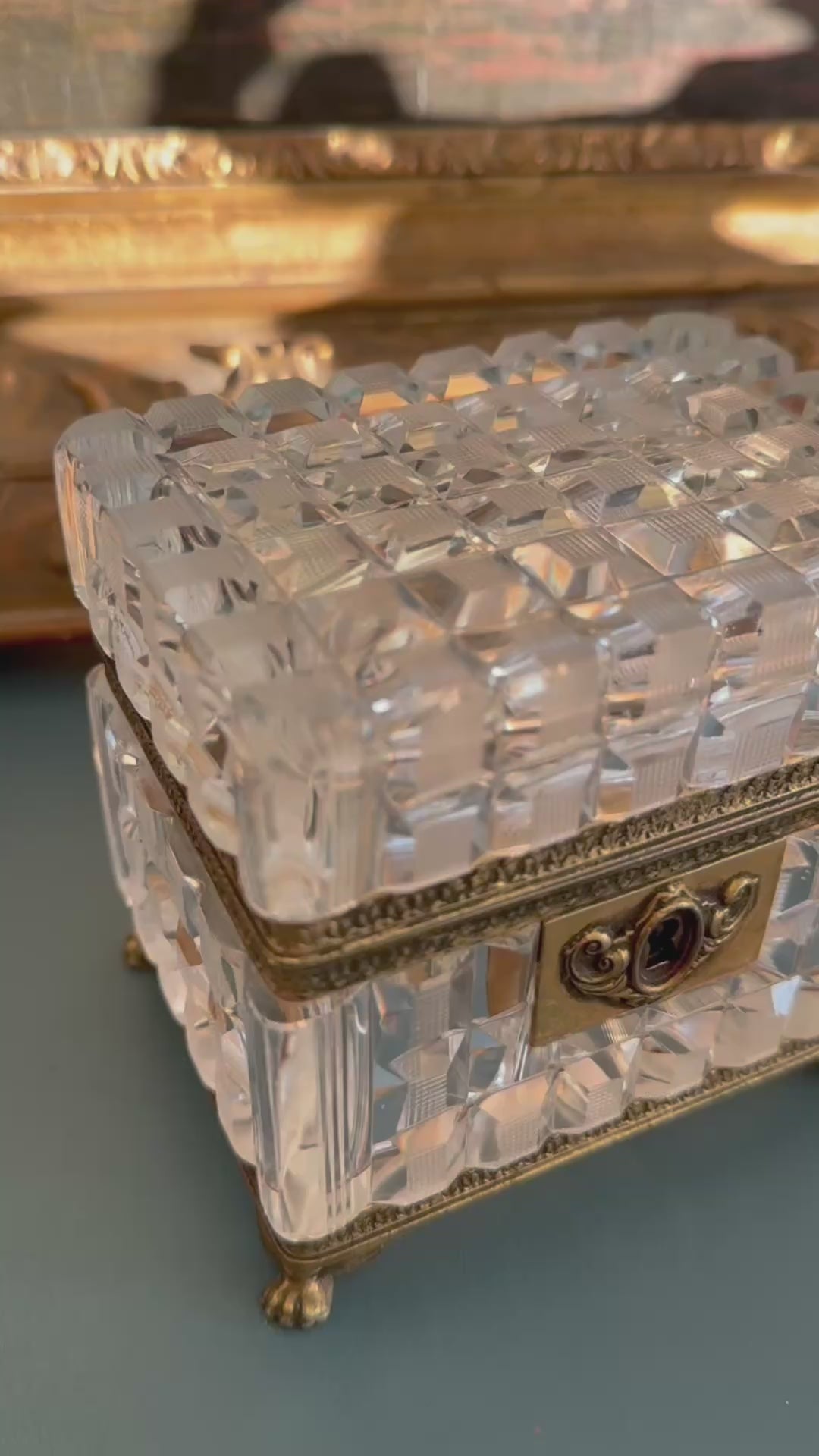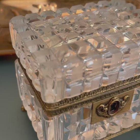 This antique French crystal casket is a beautifully proportioned decorative box, crafted with deeply cut crystal panels that reflect light with remarkable brilliance. The crystal has exceptional clarity, creating a soft, luminous sparkle that feels elegant rather than showy.