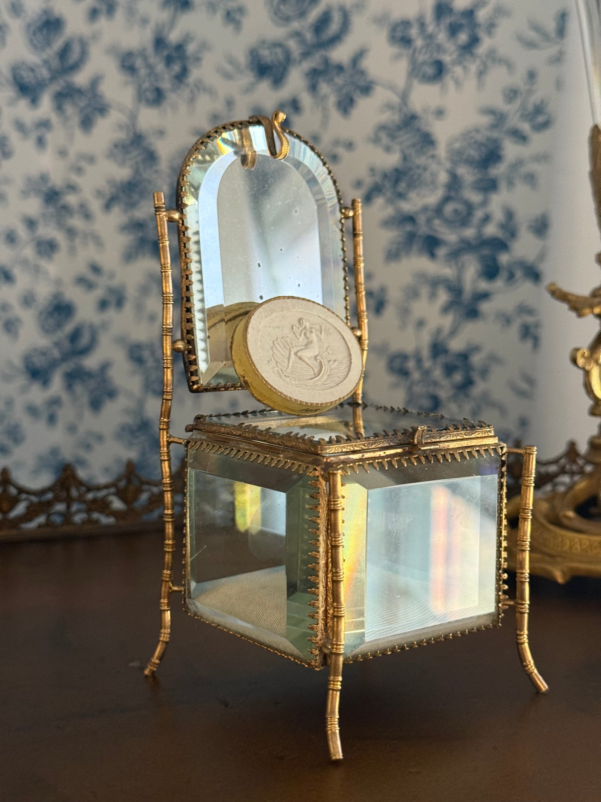 Crafted with gilt metal framing and beveled glass panels, the lower casket creates a jewel-box effect, elevating the piece beyond a simple stand into a true objet d’art. The reflective mirror above allows the watch to be admired while safely stored, blending everyday ritual with beauty.