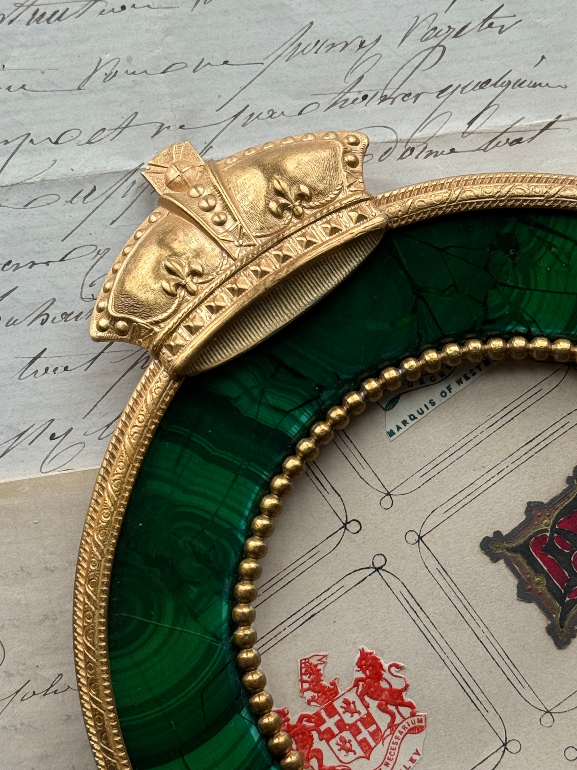 Circular malachite frames are less commonly encountered than rectangular examples and were favored as decorative desk or cabinet objects rather than large display pieces. The reverse retains its original metal backing with easel stand and velvet covering.
