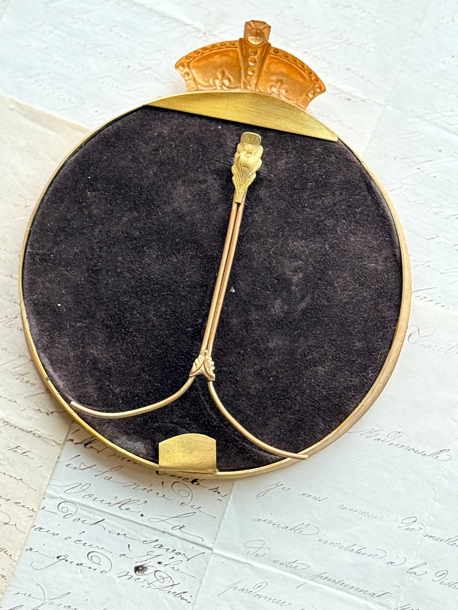 The frame is topped with a finely detailed gilt metal crown, an ornamental feature characteristic of Russian decorative arts of the period and reflective of the European influences favored by aristocratic interiors. A textured rope-twist outer border and beaded inner surround add subtle depth and refinement to the design.