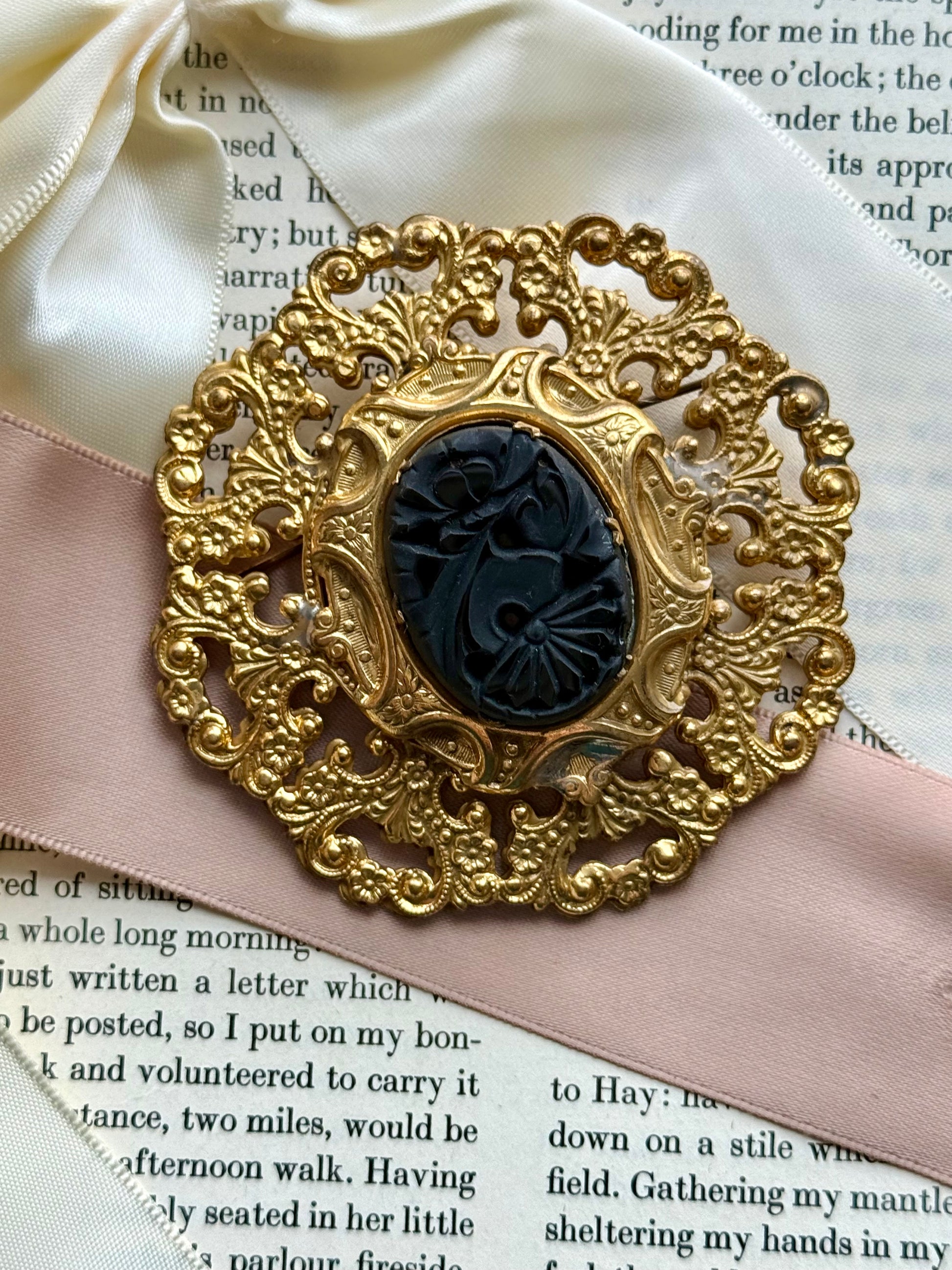 Victorian Gilt Filigree Cameo Brooch. An exquisite cameo brooch featuring an ornate gilt filigree mounting with a carved black cameo at its center. The brooch is richly detailed with high-relief scrollwork, floral motifs, and a warm gold-toned finish typical of late 19th-century European jewelry.