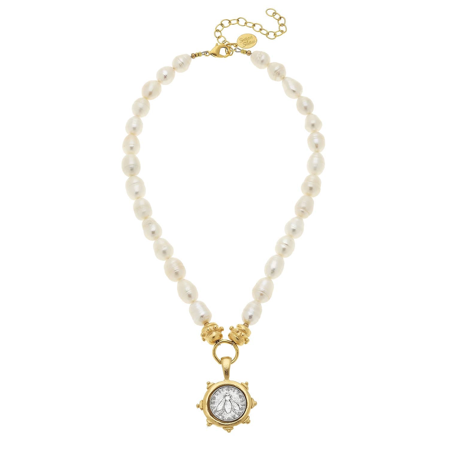 Experience the elegance and sophistication of Susan Shaw's jewelry with the Handcast Gold and Silver Bee Italian Coin on Genuine Freshwater Pearl Necklace. This pendant/charm necklace is a unique piece, featuring a 15" chain with a 3" extender, and a pendant measuring 1.13" x 1.5". It is secured with a lobster claw clasp for added safety. Each piece is carefully handcrafted in San Antonio, TX by experienced artists using the highest quality plating methods. Inspired by Northern European styling, this necklace is a testament to Susan Shaw's dedication to quality and customer satisfaction.