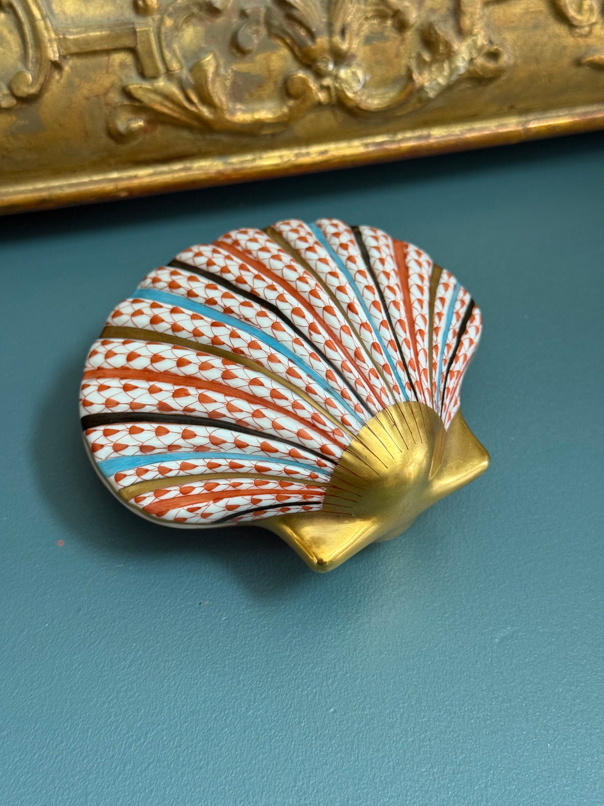 This striking porcelain shell was crafted by Herend Hungary, renowned for its centuries-old tradition of fine hand-painted porcelain. Modeled in a fan-shaped shell form, the surface is decorated with Herend’s signature fishnet pattern in warm coral red, accented with slender bands of turquoise, black, and gilt that emphasize the natural ribbing of the shell.